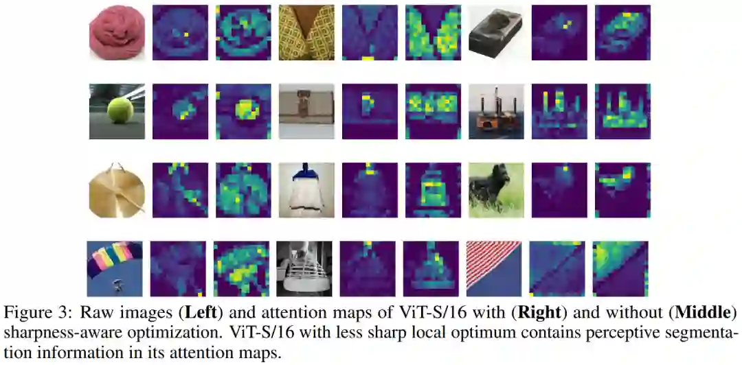 在图3中可视化了classification token的attention map。有趣的是,经过SAM优化的ViT模型能够编码合理的分割信息,比传统SGD优化训练的模型具有更好的可解释性。