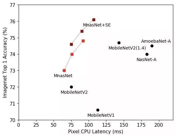 ImageNet 上的首位准确率与推理延迟对比。论文新方法找到的模型标记为 MnasNet