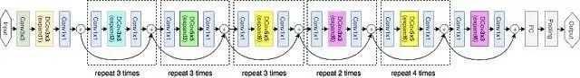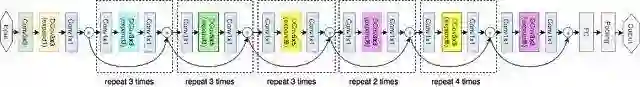 图示为从新的因子分解层级化搜索空间中采样得到的一个 MnasNet 网络,整个网络架构中可以有多种不同的层