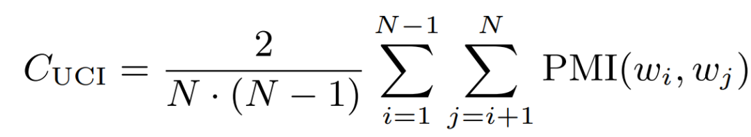 C_uci:本方法由 University of California Irvine(UCI)的 David Newman 提出,故而称其为 UCI 方法。本方法的基本原理是基于滑动窗口,对给定主题词中的所有单词对(one-set 分割)的点态互信息 (point twise mutual information, PMI) 进行计算。
