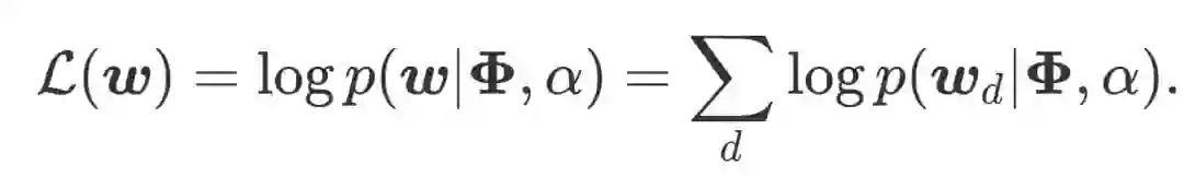 简单来说,混淆度就是利用概率计算某个主题模型在测试集上的表现,混淆度越低,则说明这个主题模型越好。具体来说,就是在给定一个主题分布的情况下,计算某个文档的 log-likelihood。在下面这个式子里,\Phi 代表给定的主题矩阵,α参数确定主题的分布,w 则指代我们要预测的文章(d,与训练得到和α的文章的主题相同)。