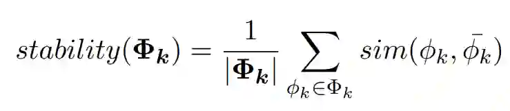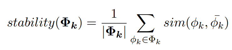 如公式所示,对于一个给定的主题 k,要计算其所有 Gibbs Sampler 提取出的词分布的平均值与各个 Gibbs Sampler 提取的词分布的相似度 (原论文 [4] 中使用了 cosine similarity, Euclidean distance, KL-divergence 以及 Jaccard similarity 来计算这个相似度),取和后就得到了这个主题的主题稳定度。