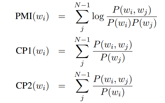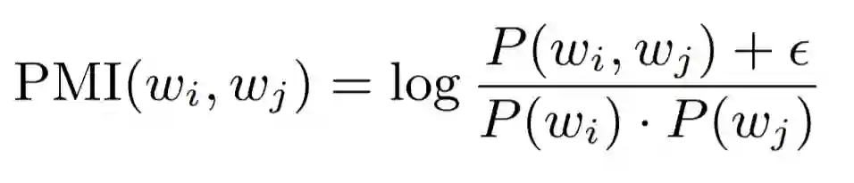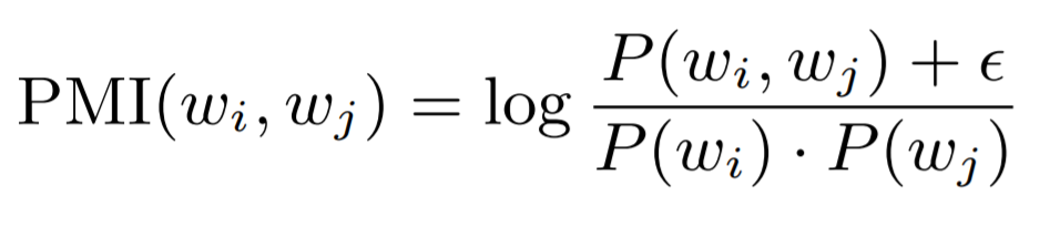 PMI:为了了解其他几种方式的计算方法,首先要先看一下 PMI 的计算方法(如下图所示)。在后面的两个方法中,这里\epsilon 的越小,将会得到越小的结果。这个公式可能看起来有些费解,不过没关系,可以先放一下,在后面看到例子之后,这个公式就很好理解了。