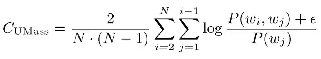C_umass:本方法由 University of Massachusetts(UMASS)的 Hanna M. Wallach 等人提出,故而称其为 UMASS 方法。本方法的基本原理是基于文档并发计数,利用 one-preceding(每个词只与位于其前面词组成词对)分割和对数条件概率计算连贯度。