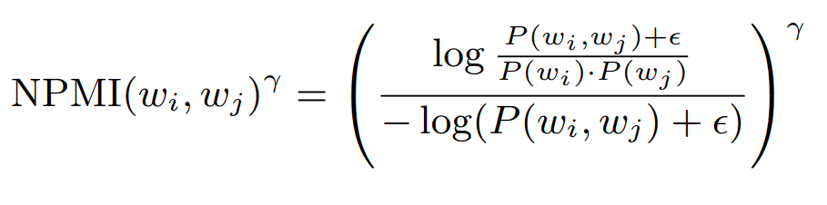 C_npmi:本方法使用归一化点态互信息 (NPMI) 的,与 C_uci 很类似,只是将 PMI 换成 NPMI,算是 C_uci 的增强版。具体来说,NPMI 的计算方法如下图所示。