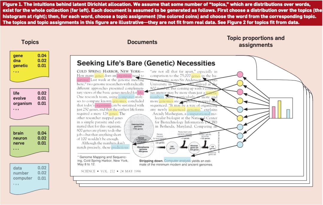 图 1:主题模型(图源:https://medium.com/@tengyuanchang/%E7%9B%B4%E8%A7%80%E7%90%86%E8%A7%A3-lda-latent-dirichlet-allocation-%E8%88%87%E6%96%87%E4%BB%B6%E4%B8%BB%E9%A1%8C%E6%A8%A1%E5%9E%8B-ab4f26c27184)