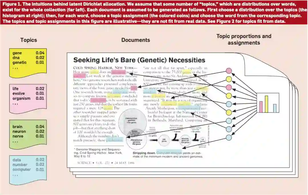如图 1 所示,最左边的就是各个主题(提前确定好的),然后在文中不同的颜色对应不同的主题,比如黄色可能对应狗,那么文中跟狗相关的词都会标成黄色,这样最后就能获得一个各个主题可能的主题分布。