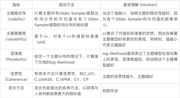 有些方法被称为直接方法,这些方法主要基于语言的内部特性进行判断,比如说 Newman et al. (2010) 提出的主题连贯性(Topic Coherence)就利用 PMI(Pairwise Pointwise Mutual Information)对主题词间的连贯性进行计算,后面其他人也对这种连贯性的计算方式进行了改进,但是本质上还是在计算连贯性(会在后文详述);还有一些方法被称为间接方法,这些方法不是直接通过语言内部特性进行判断的,而是采用一些其它的方式,比如在下游任务中的表现,或是在测试集中的表现(混淆度,perplexity)。就包括。本节剩下的部分就会对这些方法进行详述。
