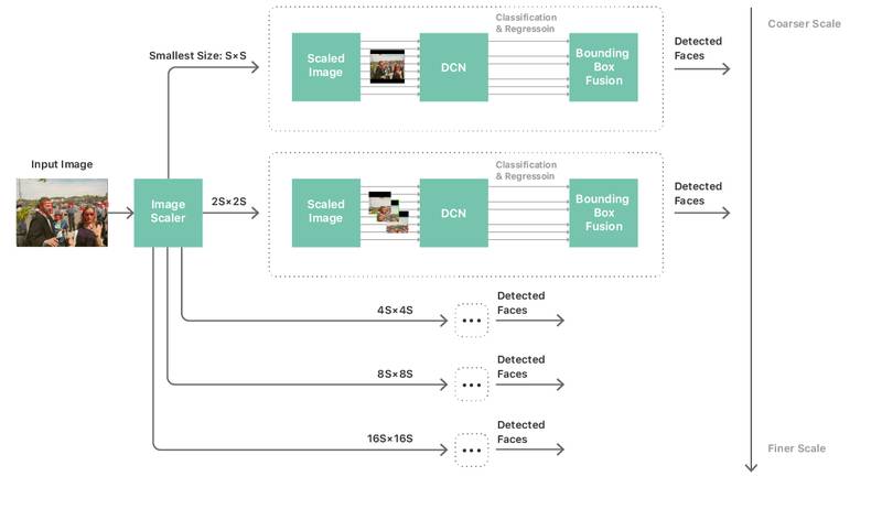 有了神经网络,可以建立一个标准的人脸检测处理流水线,这个流水线由一个多尺度的图像金字塔、人脸检测器网络和一个后处理模块组成。 多尺度的金字塔用来处理各种尺寸的面孔,将网络应用到金字塔的每个层,并从每一层收集预测信息。 (见图 2)。随后,后处理模块将这些检测结果进行组合, 产生神经网络对图像中的面部检测最终结果对应的边界框列表。