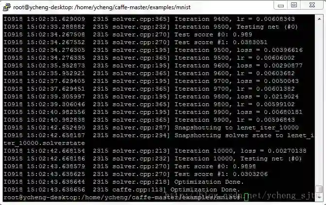 其中每100次迭代次数显示一次训练时lr(learningrate),和loss(训练损失函数),每500次测试一次,输出score 0(准确率)和score 1(测试损失函数)
