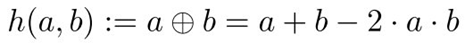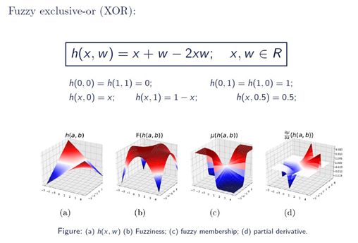 我最近的工作 Generalized Hamming Network(GHN)在网络结构上属于上图(i)这类,即对每个神经元进行模糊化的类型。而与传统 FNN 的区别,在于不需要刻意添加模糊过程,而是对一般的神经元计算进行规范,使之遵循模糊逻辑的「异或」运算规则。具体的运算公式也很简洁 (如下),很容易验证,这个公式在输入 0 或 1 时,就退化为一般的二值异或运算。而下图中的红蓝函数曲面,可以看作是扩展到实数域的真值表。其中,偏红或蓝的部分,代表确定性高的判断,而白色接近 0.5 的区域则包含了比较模糊,不确定的判断 (细节见 [1])。