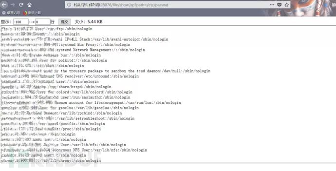 5、同样的方法,发现show.jsp存在任意文件读取漏洞,URL:http://x.x.x.x:28076/file/show.jsp?path=/etc/passwd。