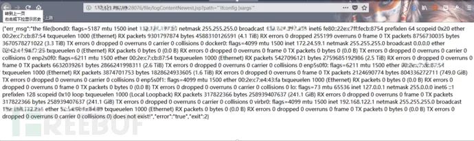 经过多次测试,最终可用反引号“或者$()进行命令执行,如`ifconfig`: