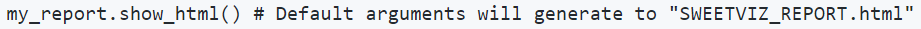 sweetviz使用的原理是,使用一行代码,生成一个数据报告的对象(其中,my_dataframe是pandas中的DataFrame,一种表格型数据结构):