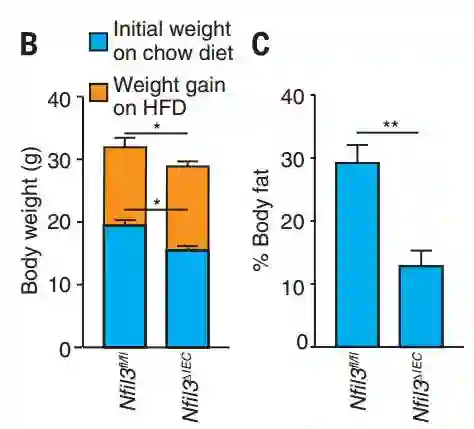 与正常小鼠相比,无菌小鼠和NFIL3基因敲除小鼠的脂肪吸收和储存量显著减少。这表明,肠道微生物促进脂肪吸收和储存确实是通过调节NFIL3转录因子表达实现的。