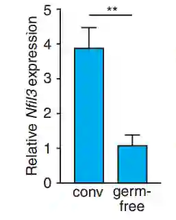 与无菌小鼠相比,含有肠道微生物的正常小鼠小肠上皮细胞中NFIL3转录因子的表达量显著上调近70%。