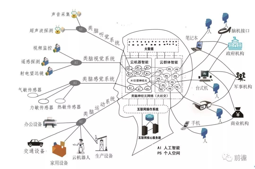 互联网大脑的结构日趋复杂,越来越多的新元素、新概念开始相互交织。而这些代表着前沿科技、行业产业、科技企业、社会与哲学等诸多领域的若干名词,无不与互联网大脑架构的形成和发育有关。如果说连接计算机的世界之网是互联网的原有架构,那么由这些图示概念交织而成的互联网大脑结构则构成了超级智能的运行机制。在这一新兴崛起的科技名词“超级智能”的运行轨道里,人成为互联网定义中新的重要元素,传感器的加入使互联网产生感觉神经系统,云机器人和智能设备构成互联网的运动神经系统,构建人与人、人与物、物与物的大社交网络架构则是类脑神经元网络的技术基础……