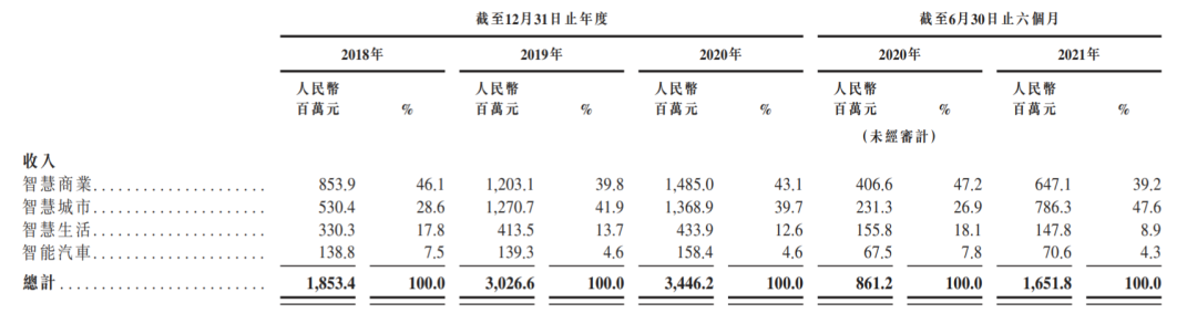 从公司收入上看,招股说明书显示,2021年上半年,商汤公司总收入为16.518亿人民币。主要业务分智慧商业、智慧城市、智慧生活和智能汽车四大块。其中智慧商业、智慧城市两个板块的营收占比超过80%。