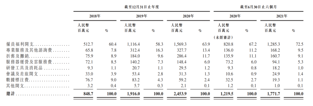 招股说明书显示,2021年上半年,商汤的技术研发投入共计17.717亿元。其中最大的投入是雇员福利开支,共计12.85亿元,占技术研发投入的72.3%。