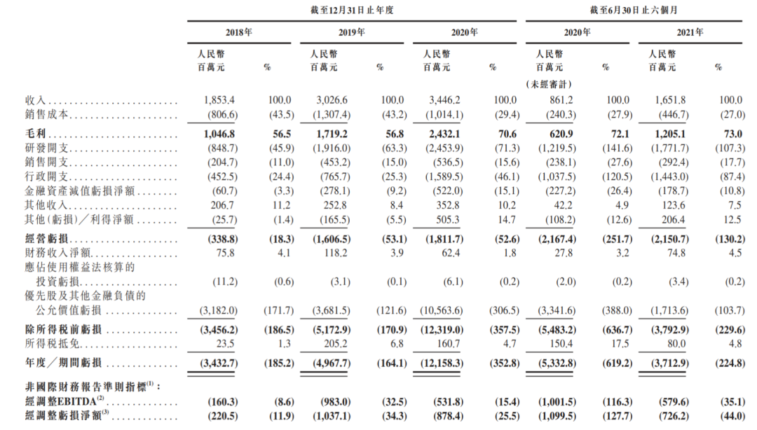 总体来看,商汤在财务数据上最大的亮点是毛利率,2021年上半年,商汤实现了73%的毛利率,且2020年也在70%以上,这一指标数据明显高于旷视、云从等主要竞争对手。
