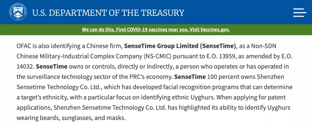 同日,美国财政部宣布将商汤科技列入「中国军工复合体清单」,禁止美国资本注入。