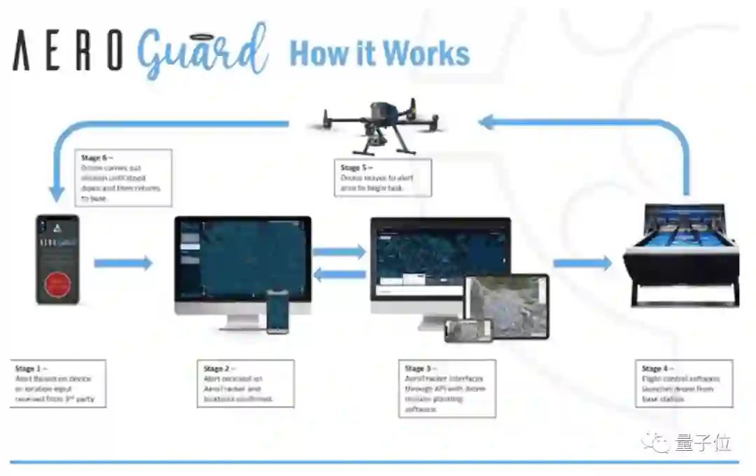 然后无人机收到并确认信息后,即刻起飞赶往现场,展开护航。