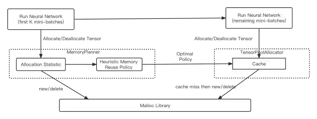 如何做到既高效又有效的使用内存,对于稀疏模型的训练非常关键,稀疏场景模型训练中大块内存分配使用造成大量的minor pagefault,此外,多线程分配效率存在比较严重的并发分配效率问题。针对稀疏模型训练前向、后向,Graph计算模式的相对固定、多轮反复迭代的特点,DeepRec设计了一套针对深度学习任务的内存管理方案,提高内存的使用效率和系统性能。使用DeepRec中提供的PRMalloc能够极大降低训练过程中minor pagefault,提高多线程并发内存分配、释放的效率。