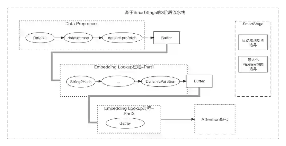 稀疏模型训练通常包含样本数据的读取、Embedding查找、Attention/MLP计算等,样本读取和Embedding查找非计算密集操作,同时并不能高效利用计算资源(CPU、GPU)。原生框架中提供的dataset.prefetch接口可以异步化样本读取操作,但Embedding查找过程中涉及特征补齐、ID化等复杂的过程,这些过程无法通过prefetch进行流水线化。SmartStage功能能够自动分析图中异步流水线化的边界并自动插入,可以使并发流水线发挥最大的性能提升。