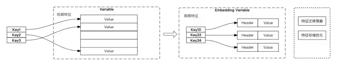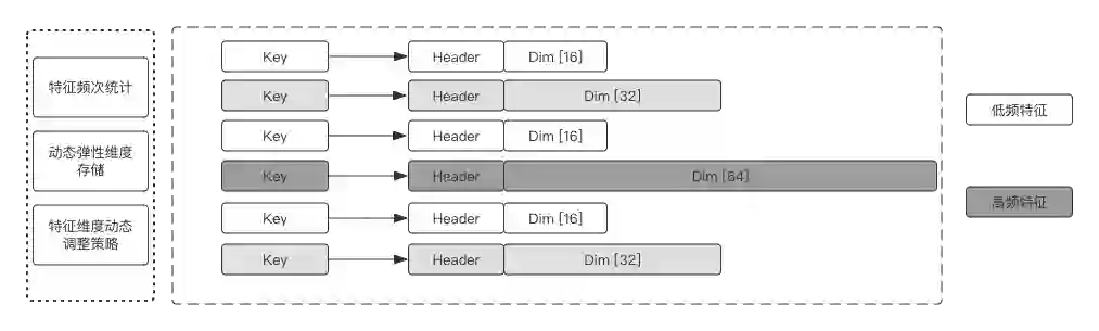 Dynamic Dimension Embedding Variable提供了同一特征列的不同特征值,根据特征的冷热自动配置不同的特征维度,高频特征可以配置更高维度增强表达能力,而低频特征因为给定低维度embedding缓解了过拟合的问题,而且可以极大程度节省内存(低频长尾特征的数量占据绝对优势)。