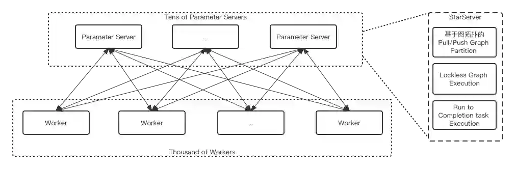 在超大规模任务场景下(几百、上千worker),原生开源框架中的一些问题被暴露出来,譬如低效的线程池调度、关键路径上的锁开销、低效的执行引擎、频繁的小包rpc带来的开销导致ParameterServer在分布式扩展时成为明显的性能瓶颈。StarServer进行了包括图、线程调度、执行引擎以及内存等优化,将原有框架中的send/recv语义修改为pull/push语义,并且在子图划分上支持了该语义,同时实现了ParameterServer端图执行过程中的lockfree,实现了无锁化的执行,大大提高了并发执行子图的效率。对比原生框架,能够提升数倍的训练性能,并且支持3000worker规模的线性分布式扩展。