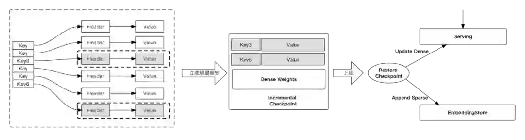时效性要求高的业务,需要频繁的线上模型更新,频率往往达到分钟级别甚至秒级。对于TB-10TB级别的超大模型而言,分钟级别的模型生成到上线很难完成。此外,超大模型的训练和预测存在着资源浪费、多节点Serving延时加大等问题。DeepRec提供了增量模型产出及加载能力,极大加速了超大模型生成和加载。