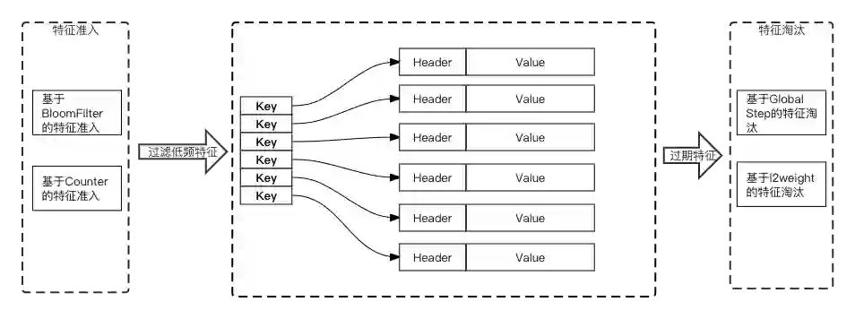 1)解决了静态Shape Variable的vocabulary_size难以预估、特征冲突、内存及IO冗余等问题,并且在DeepRec中提供了丰富的EmbeddingVariable的进阶功能,包括不同的特征准入方式、支持不同的特征淘汰策略等,能够明显提高稀疏模型的效果。