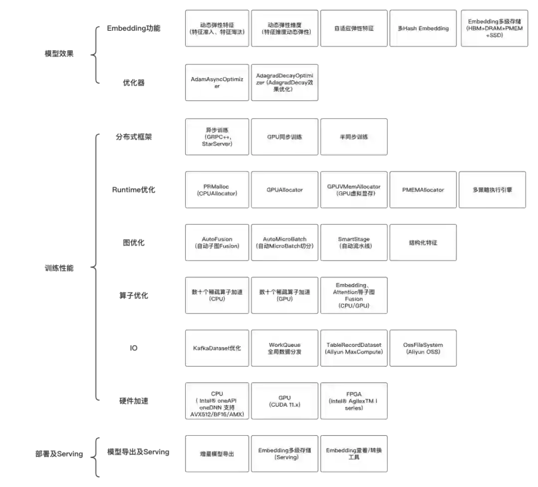 DeepRec在分布式、图优化、算子、Runtime等方面对稀疏模型进行了深度性能优化,同时提供了稀疏场景下特有的Embedding相关功能。
