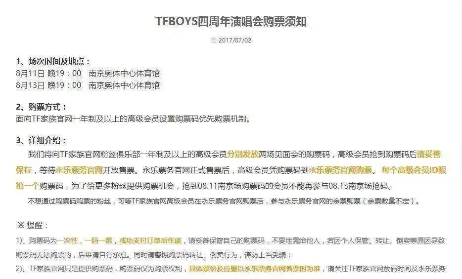彼时,官方规定是无论购买哪个档次的演唱会门票,都需先缴纳300元成为TF家族的高级会员,才有机会抢码,获得购票资格。虽然引发不满,还遭到了工商局的约谈,但时代峰峻在之后的周年演唱会中依然采用了这一方式。