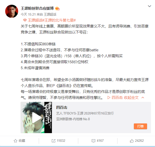 由此来看,无论是放在国内还是国外,TFBOYS7周年线上演唱会的860都属偏高档位,发稿前夕,已经有成员后援会公开发声不提倡粉丝购买该价位门票。