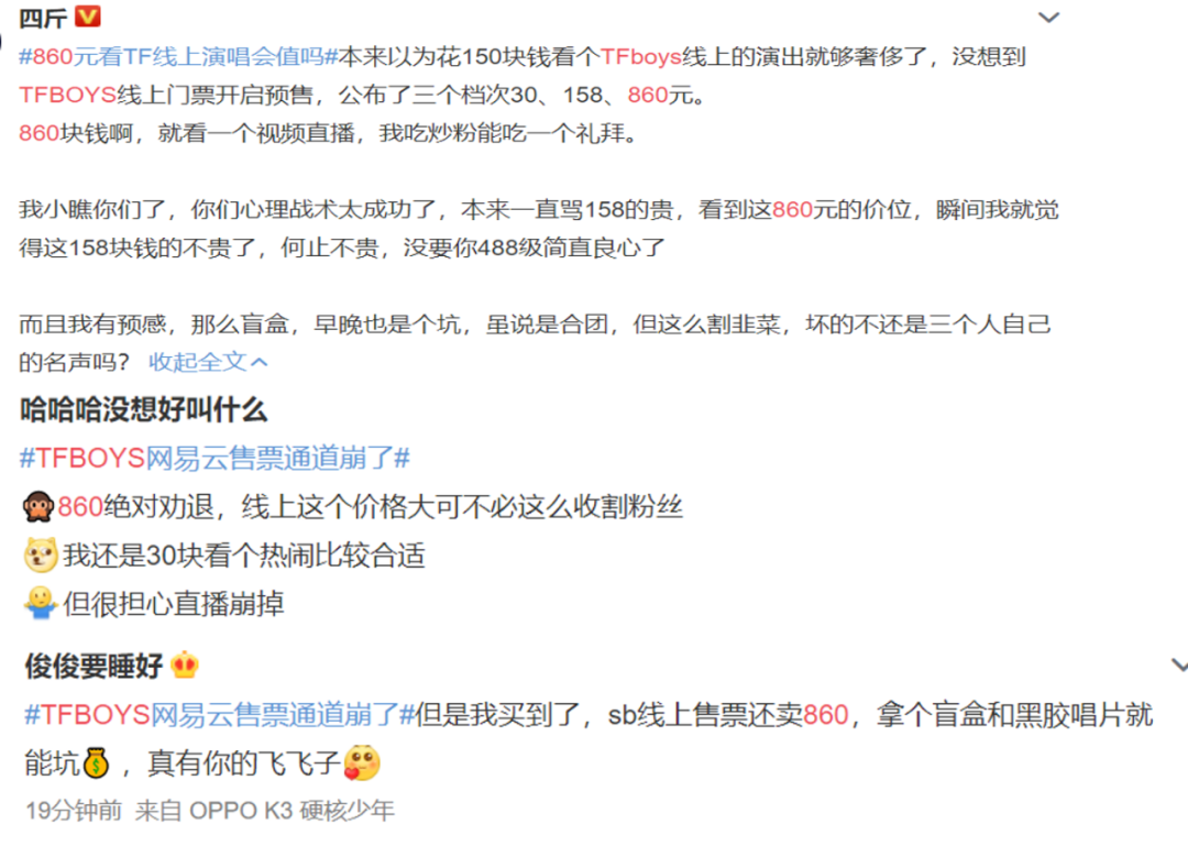 值得一提的是,在粉丝们吐槽平台的声音中还有不少人将矛头指向了TFBOYS经纪公司时代峰峻。因为与之前被剧透的不同,本次演唱会不仅开启了直播分档售票的先河,而且刷新了国内线上演唱会的最高票价。