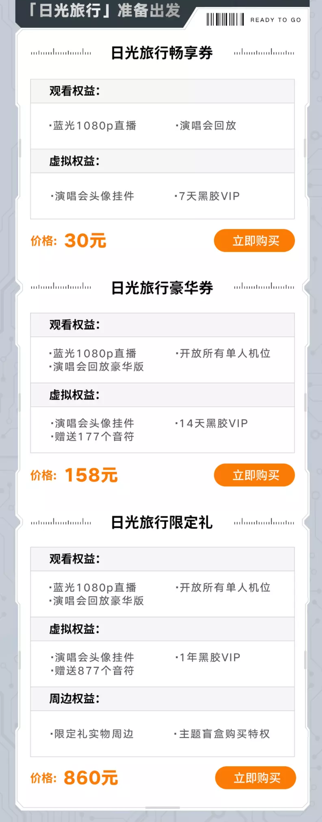 售票平台显示,票价分为30元、158元和860元三档,其中860元除了相对丰富的直播功能之外,还包含T恤、渔夫帽、单肩包等实体礼品以及TFBOYS成员公仔的盲盒购买资格。