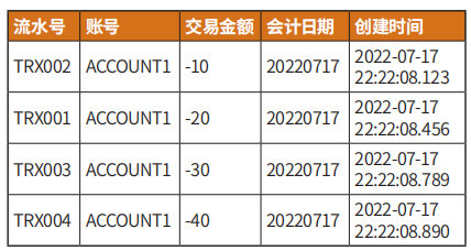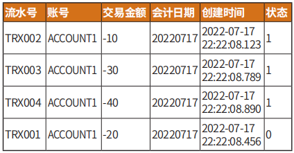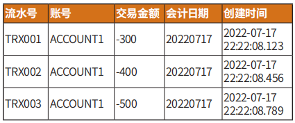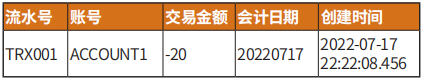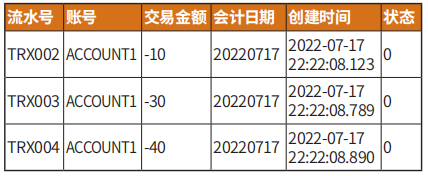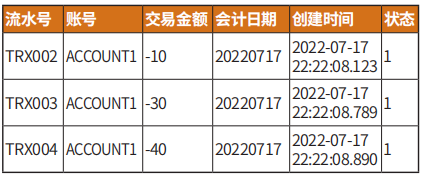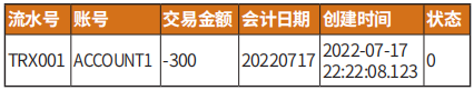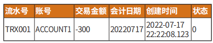第一笔交易TRX001进来,扣账300,执行联机步骤完成后,数据情况如表9、表10所示。