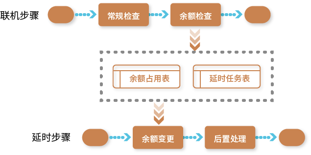 联机步骤执行成功,交易就可以认为成功了,只是交易资金临时放在延时任务表中,没有入账。延时步骤主要处理资金入账及相关后置操作。延时处理步骤是个定时任务,例如1分钟执行一次。下面具体介绍延时步骤每次被触发后的处理过程。