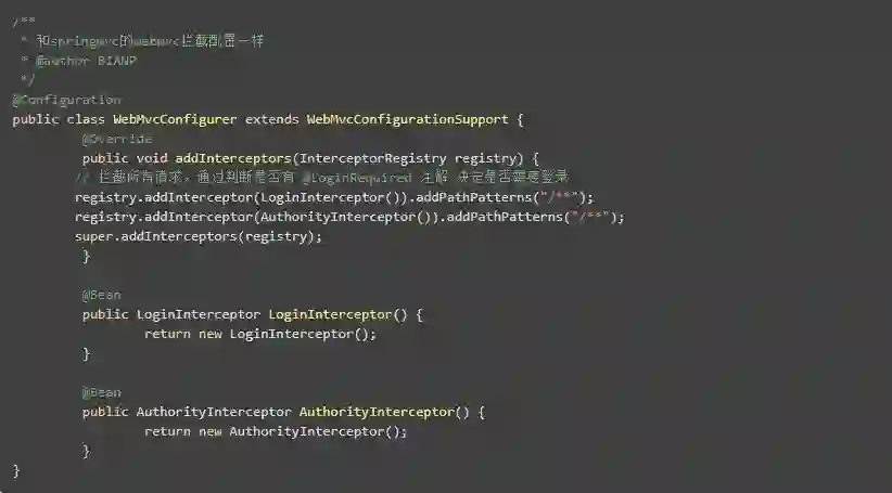 一定要加@Configuration 这个注解,在启动的时候在会被加载。还有一些教程是用的“WebMvcConfigurerAdapter”,也是一样的,但是会提示这个方法是过时的了。