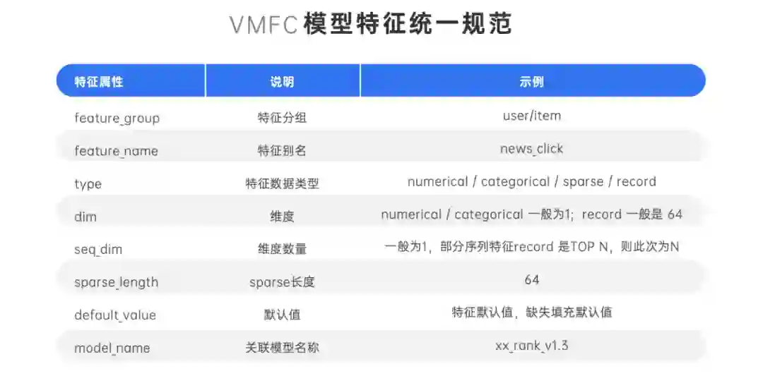 “模型即服务”(MaaS)落地的基础是统一规范,为了打通离线训练与在线推理的特征解析,我们对多个业务进行抽象设计,制定了 vivo 模型特征统一配置规范,VMFC(vivo Model Feature Configration)。