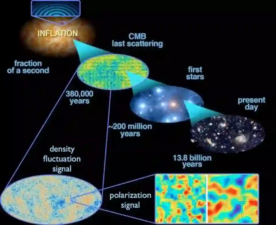 来源:E. Siegel, with images derived from ESA/Planck and the DoE/NASA/ NSF interagency task force on CMB research