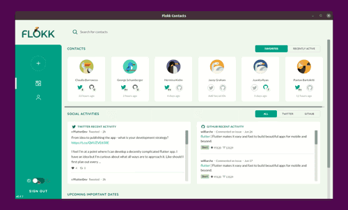 除了能够管理用户的联系人(包括搜索联系人、添加新联系人和编辑现有联系人)之外,用户在 Flokk 中还能将 GitHub 和 Twitter 处理的信息与联系人相关联。此外,Flokk 还使用了一系列 Flutter 特性来改进 UI 体验。例如,应用不仅有深色主题,而且在切换颜色主题时还有动画效果。