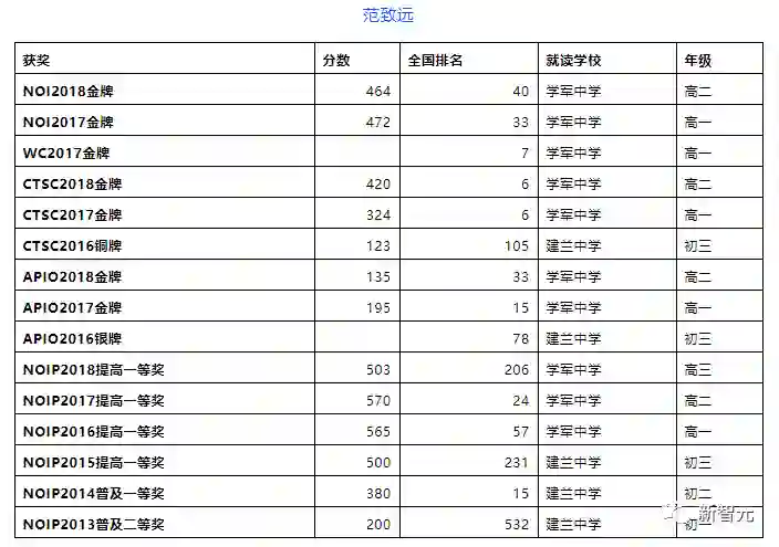 再看看范致远曾经就读的杭州学军中学,两次获世界冠军,获国际金牌3枚,亚太地区金牌29枚、全国金牌23枚,全国联赛一等奖259人次。