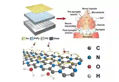 为解决上述问题,中国科学院上海微系统与信息技术研究所研究员丁古巧课题组与深圳大学电子科学与技术学院副教授韩素婷、深圳大学高等研究院研究员周晔合作,利用新型碳基二维半导体材料C3N实现了可调突触行为的人工突触模拟忆阻器。该器件可以实现电阻值随着连续的电压扫描而逐渐变化的典型的忆阻行为。近常压X射线光电子能谱证实C3N薄膜中的质子传导过程实现了器件的忆阻特性。C3N中大量的晶格N原子使其成为高质量的质子接受材料。与此同时,在C3N与PVPy之间的氢键网络有助于质子传导。该忆阻器能实现多种生物突触中的突触可塑性模拟,包括兴奋性突触后电流、双脉冲易化、双脉冲抑制、双脉冲易化转换为双脉冲抑制以及强直后增强等。
