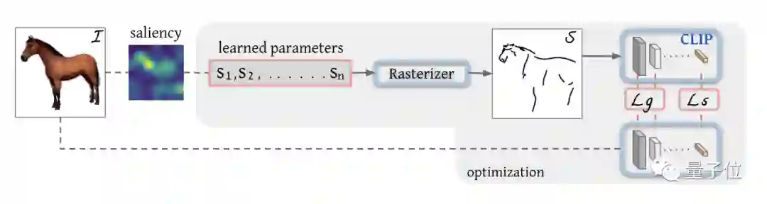 接下来就是优化线条参数了。把初始图像导入CLIP模型,计算几何损失(Lg)和语义损失(Ls)。