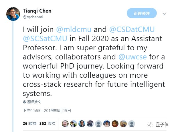 华盛顿大学博士生、SAMPL Lab和MODE Lab成员陈天奇,今天在推特上宣布,将于明年秋天加入卡内基梅隆大学(CMU),担任助理教授。