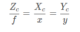 此时,假设相机坐标系中有一点M,则在理想图像坐标系下(无畸变)的成像点P的坐标为(可由相似三角形原则得出):