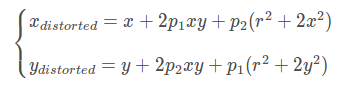 切向畸变是由于透镜本身与相机传感器平面(像平面)或图像平面不平行而产生的,这种情况多是由于透镜被粘贴到镜头模组上的安装偏差导致。畸变模型可以用两个额外的参数p1和p2来描述: