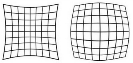 顾名思义,径向畸变就是沿着透镜半径方向分布的畸变,产生原因是光线在原理透镜中心的地方比靠近中心的地方更加弯曲,这种畸变在普通廉价的镜头中表现更加明显,径向畸变主要包括桶形畸变和枕形畸变两种。以下分别是枕形和桶形畸变示意图: